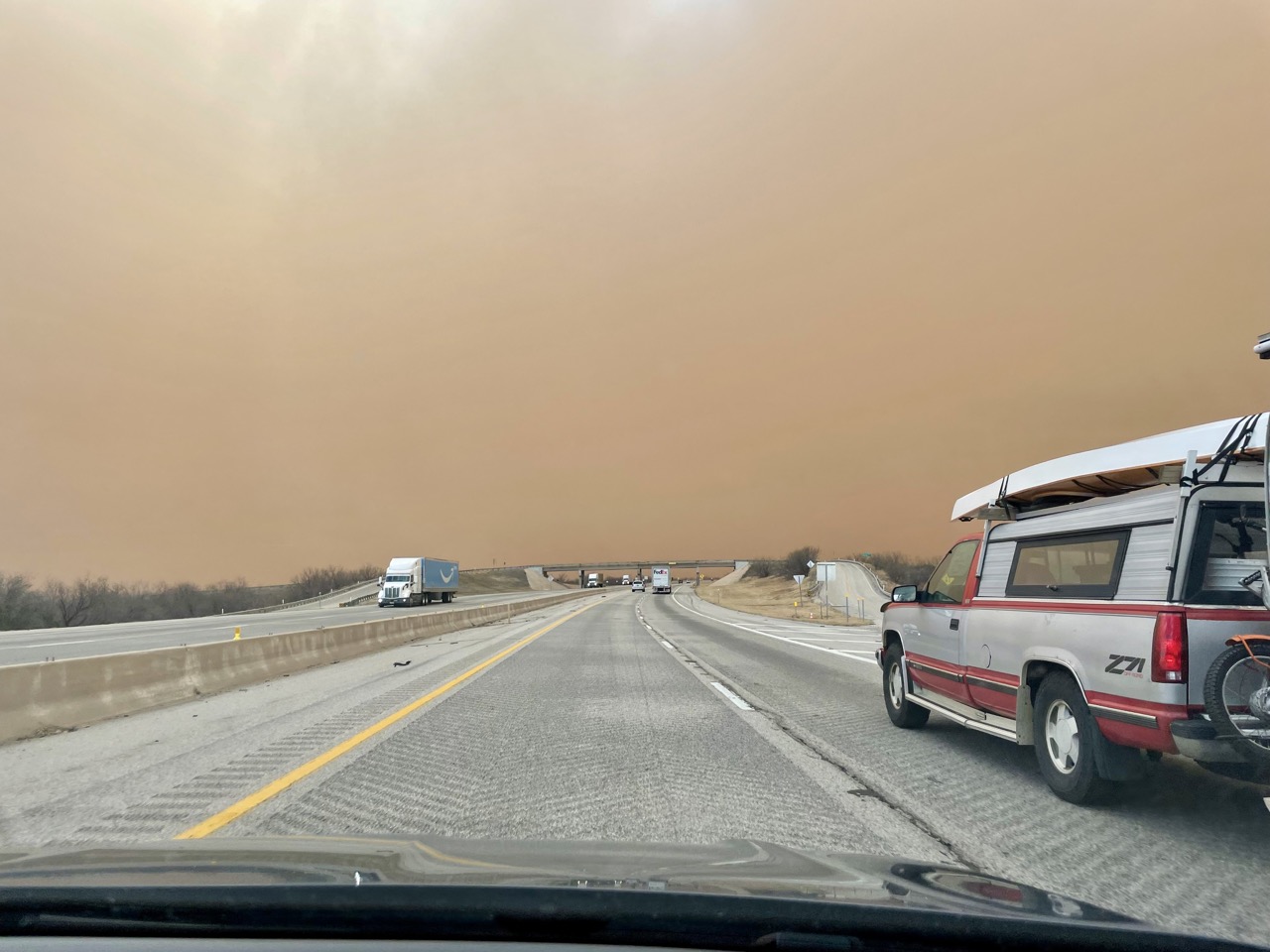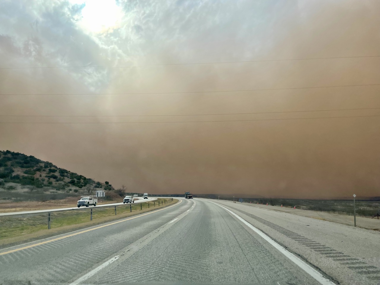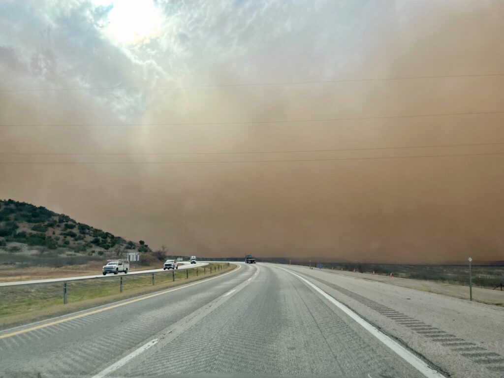 Nach etwa 10 Minuten hat sich alles aber etwas gelichtet und wir konnten weiterfahren – nur um in einen Sandsturm zu geraten. Dort sind die Tumbleweeds (das sind diese runden kleinen Büsche, die man z. B. aus Western kennt) nur so über die Straße geflogen.