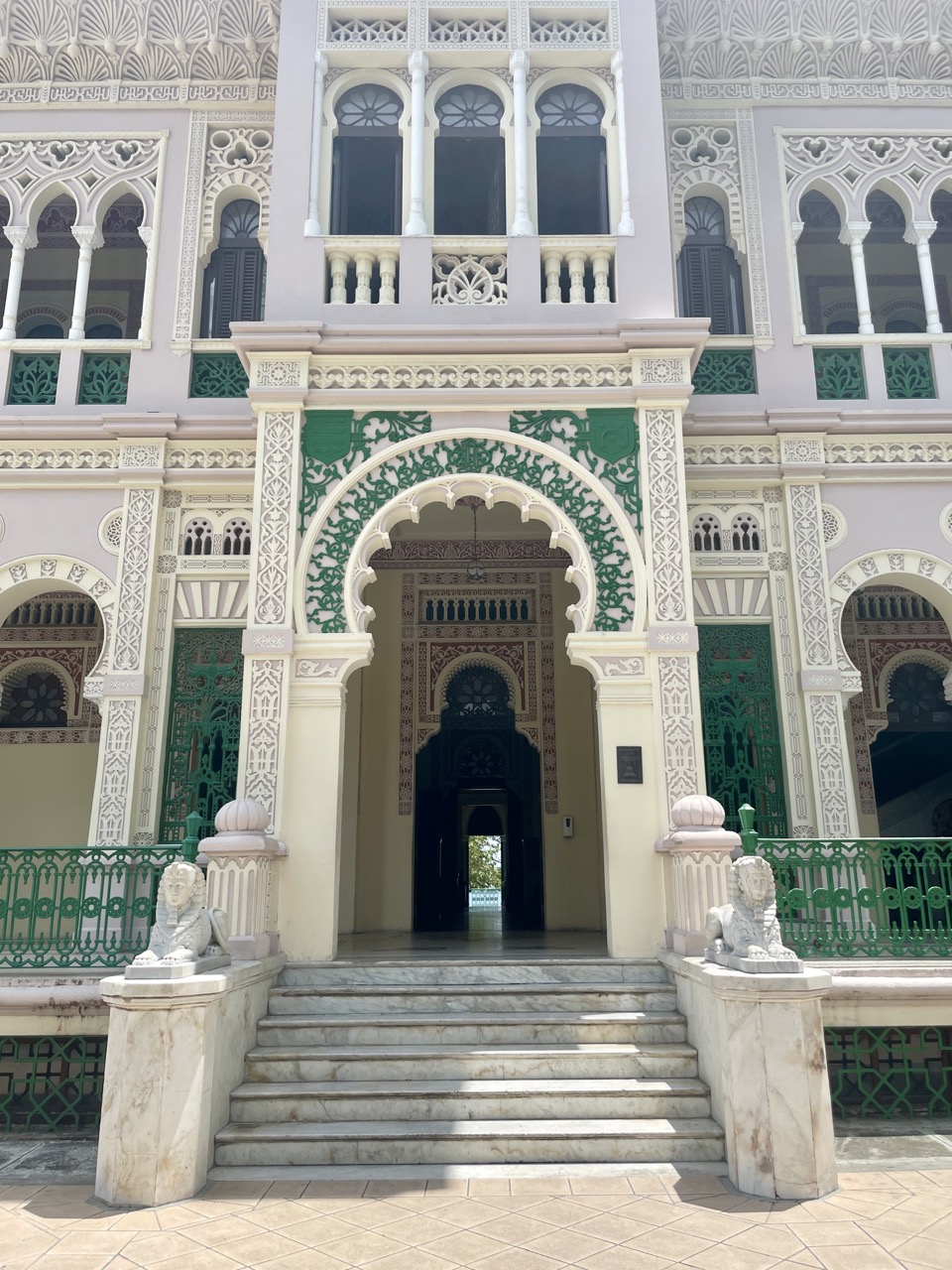 Mit einem kleinen Zug sind wir anschließend durch die Stadt gefahren und bei „Der Schönen und das Biest“ ausgestiegen. Das eine ist ein alter Palast, in dem heute ein Restaurant zu finden ist. Der Palast hat drei verschiedene Türme: Einer ist im römischen Burgstil gebaut. Er steht für Stärke. Einer ist im arabischen Stil gebaut. Er steht für die Religion. Und einer ist im indischen Palaststil gebaut. Er steht für die Liebe. Dieses Gebäude wird als „die Schöne“ bezeichnet. Wo ist also das Biest? Es steht ziemlich direkt gegenüber. Es ist ein einfaches Hotel. Ziemlich schlicht und schmucklos. Angeblich war der Plan, dass sich dort die Mafia einquartiert. Letztendlich ist es nie dazu gekommen (oder so sagt man…), aber fertiggestellt wurde es trotzdem.