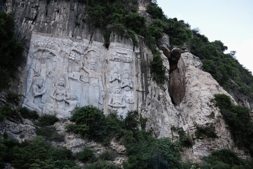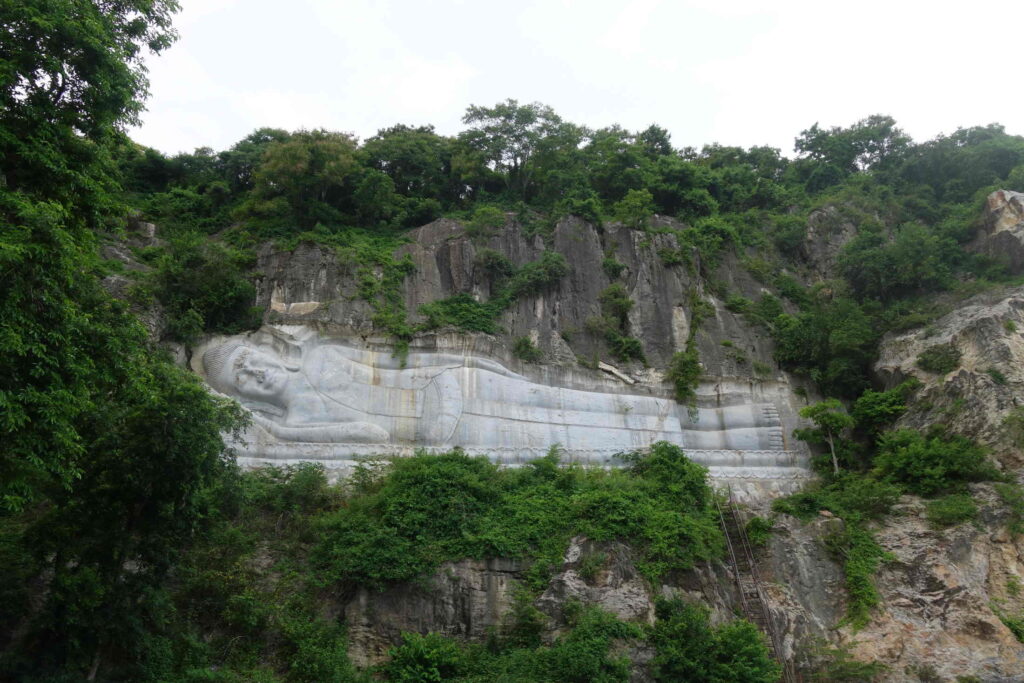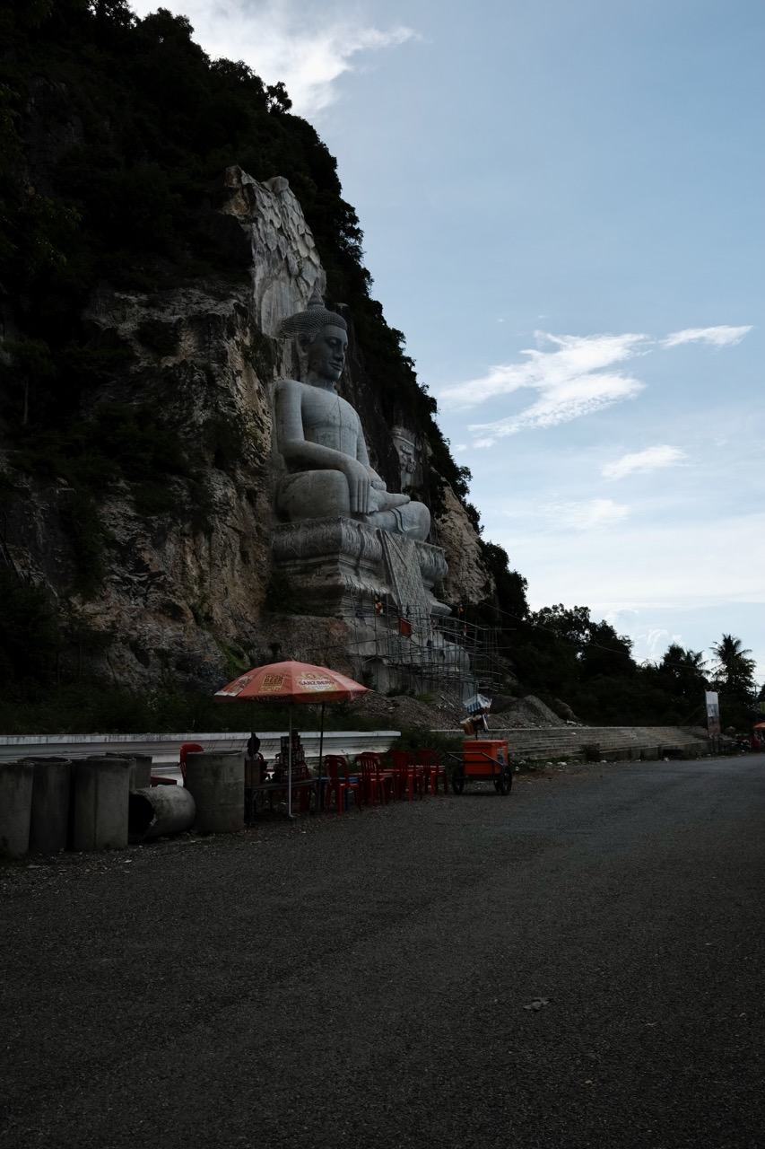 Warum wir aber eigentlich dorthin sind: Am Fuße des Hügels gibt es neben riesigen Buddha-Statuen eine Höhle mit Fledermäusen. Zur Dämmerung fliegen sie raus, um zu jagen und kommen dann nachts gegen 3 Uhr zurück. Wir konnten uns so gar nicht vorstellen, wie das aussehen soll. Fliegen sie alle auf einmal raus und es ist nach fünf Sekunden vorbei? Und wie viele werden es sein?