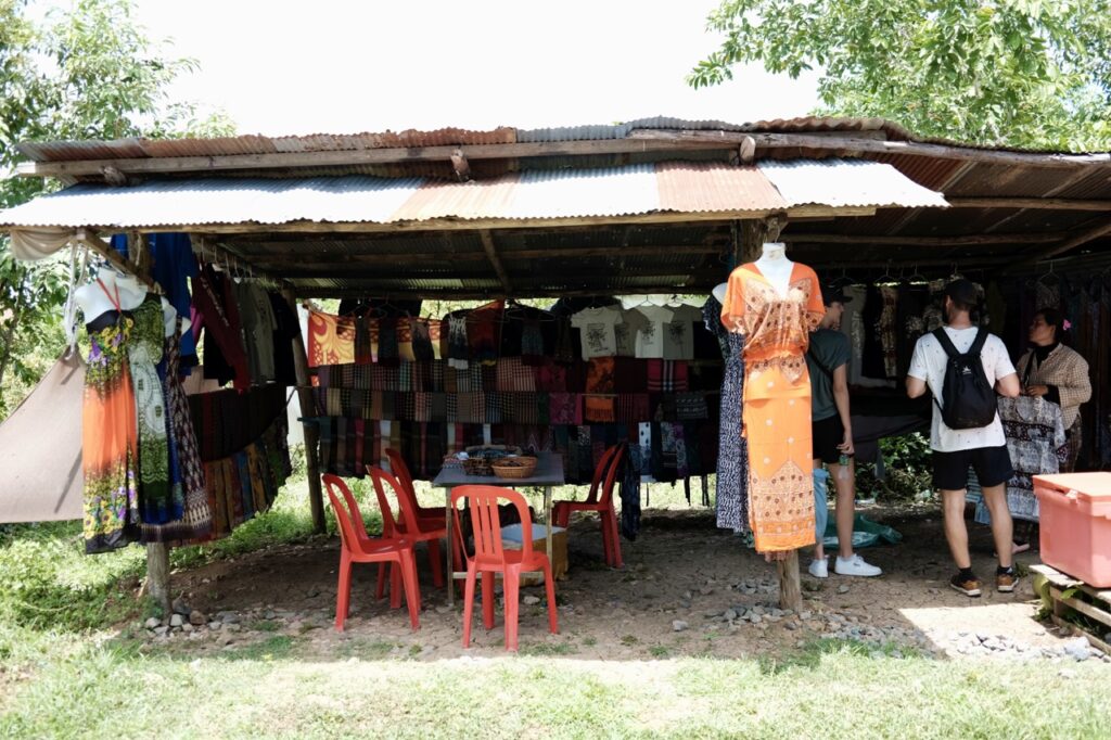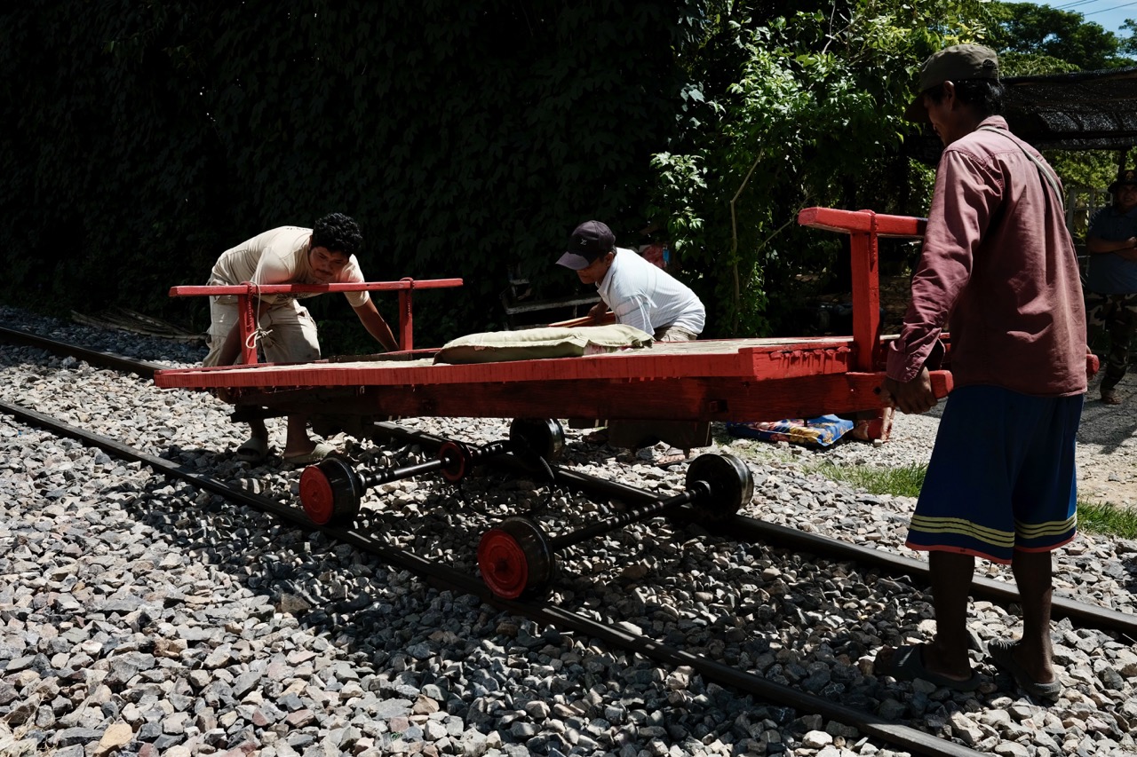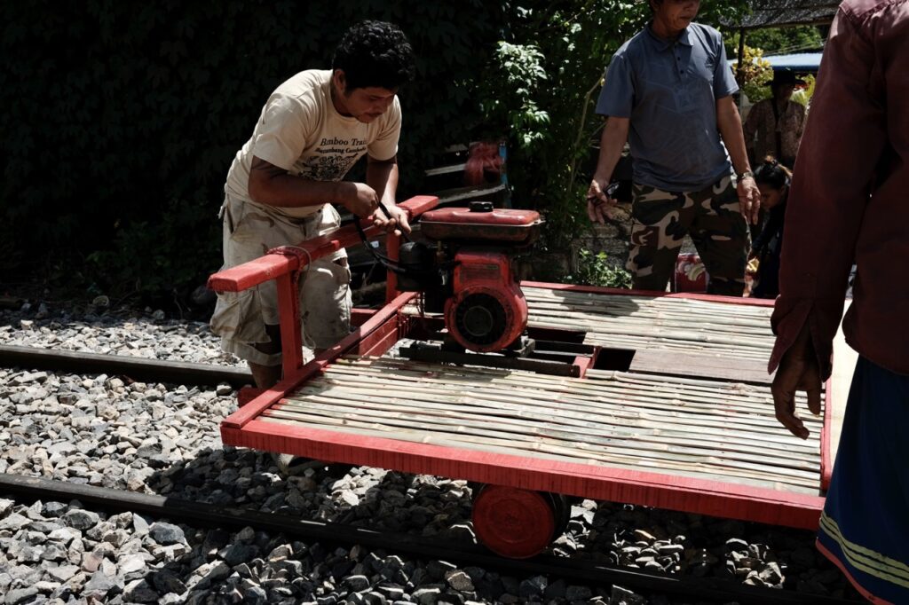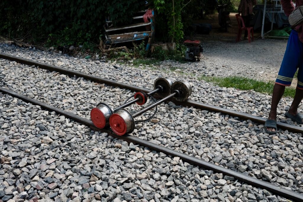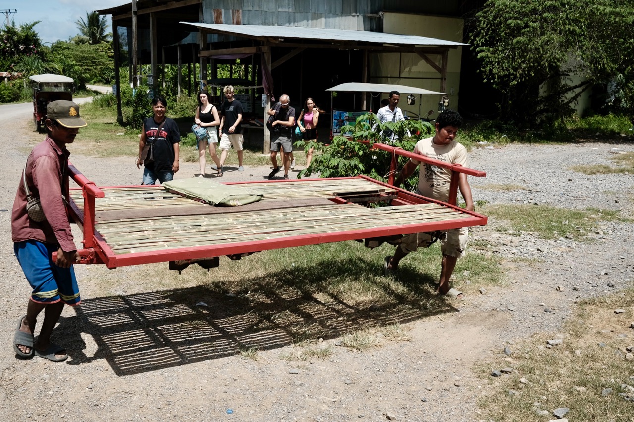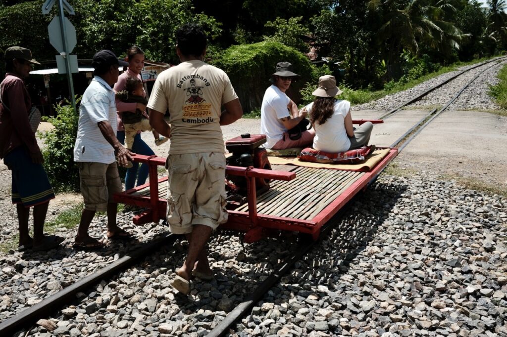 Er hat uns erst zum „Bamboo Train“ gefahren, was wir auf jeden Fall machen wollten. Das ist praktisch ein Gefährt auf Schienen, das sie erst vor unseren Augen vor Ort zusammengebaut haben. Es besteht aus zwei Achsen, einer Sitzfläche dazwischen und dem Motor mit Bremsen. An sich wurde die Strecke früher regulär als Transportstrecke genutzt, mittlerweile ist es aber nur noch eine Touristenattraktion. Man sitzt zu zweit oder zu viert plus Fahrer auf dem kleinen Wagen und fährt durch die Landschaft. Bei Gegenverkehr wird der leichtere Wagen händisch von den Gleisen gehoben. Wir sind ca. 20min hin und 20min wieder zurückgefahren. Zwischendrin gab es einen Zwischenstopp bei ein paar kleinen Shops, die natürlich ihre Waren verkaufen wollten. Auch wenn das ganze sehr touristisch war, hatten wir Spaß dabei!