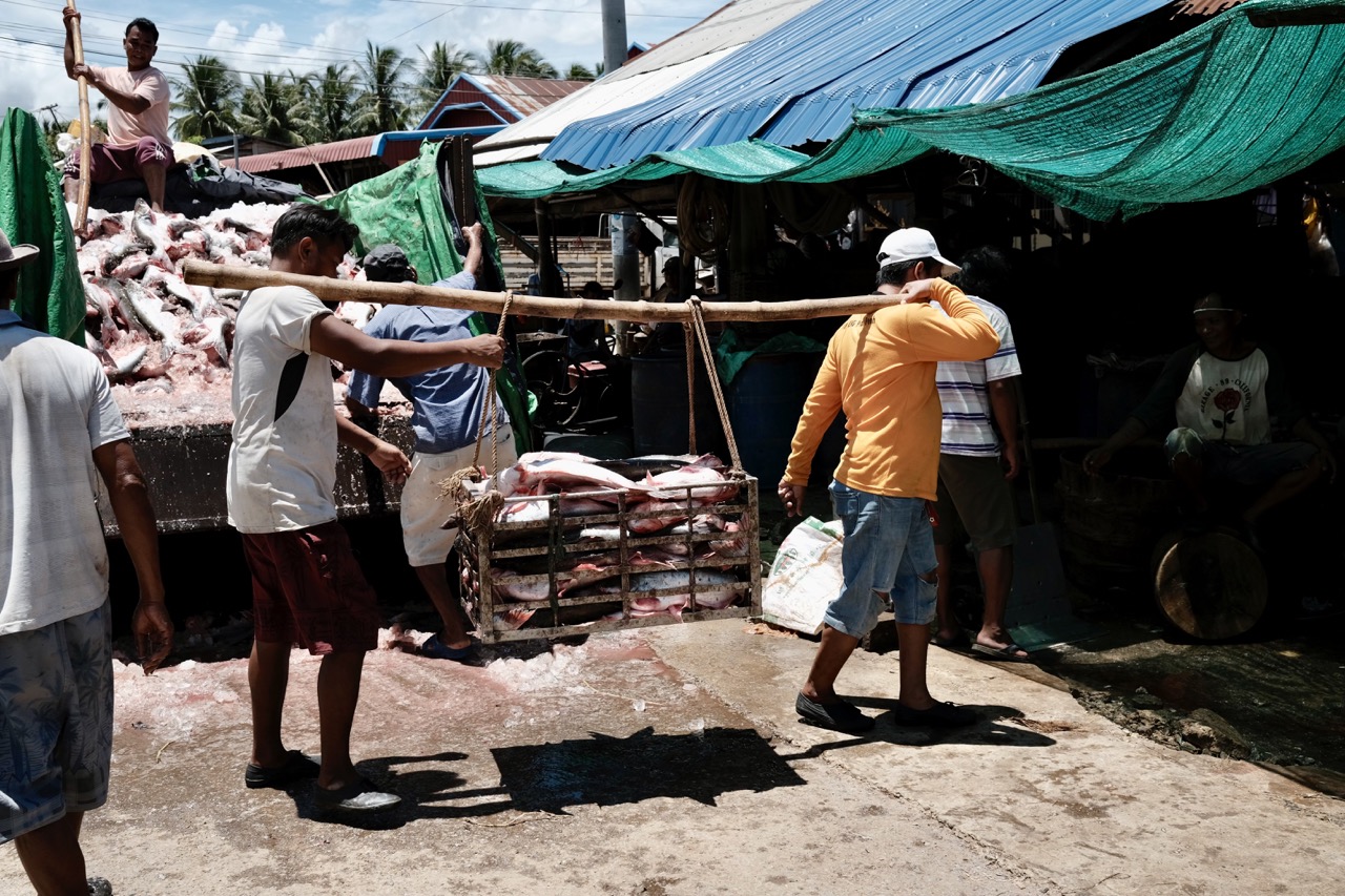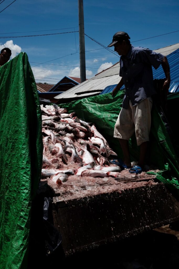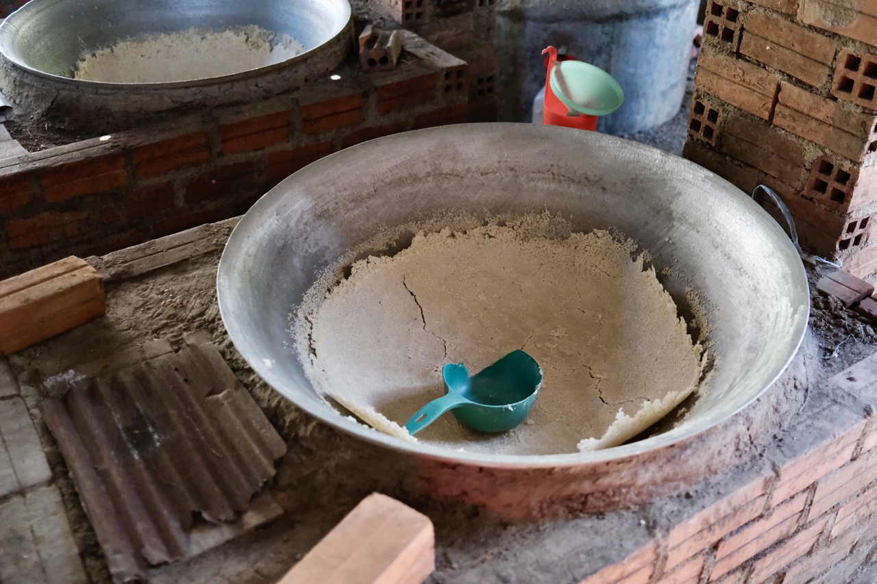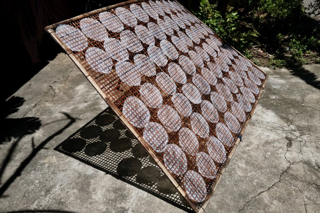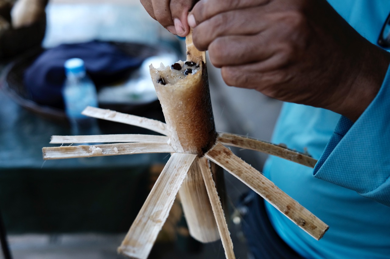 Unterwegs hat unser Guide immer mal wieder an Ständen angehalten, um uns Dinge zu zeigen. Zum Beispiel haben wir uns angesehen, wie man den Teig für die traditionellen Frühlingsrollen macht, wie man Reiswein herstellt. Und es gab „Sticky Rice“, eine Art süßer Reiskuchen, zum Probieren. Zwischendurch waren wir auch kurz auf einem Fischmarkt.