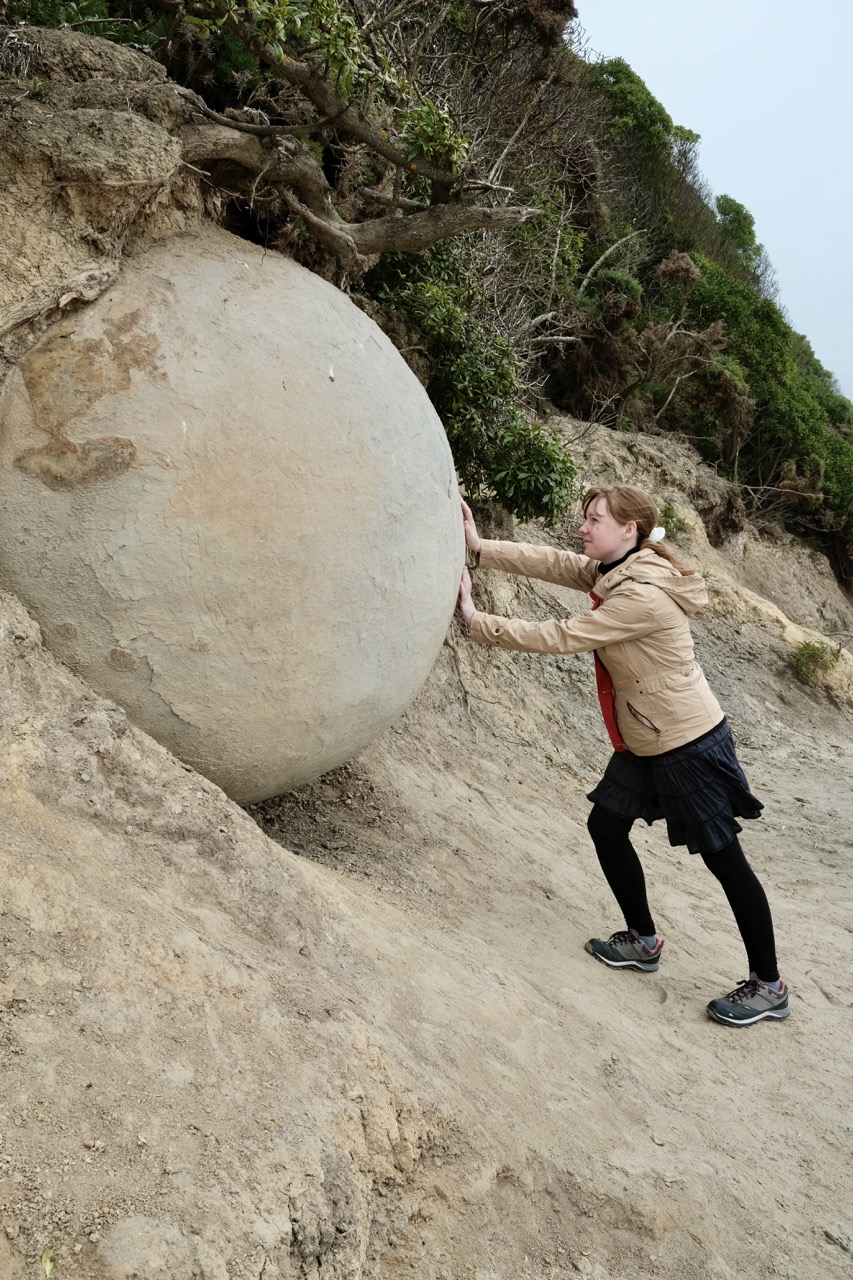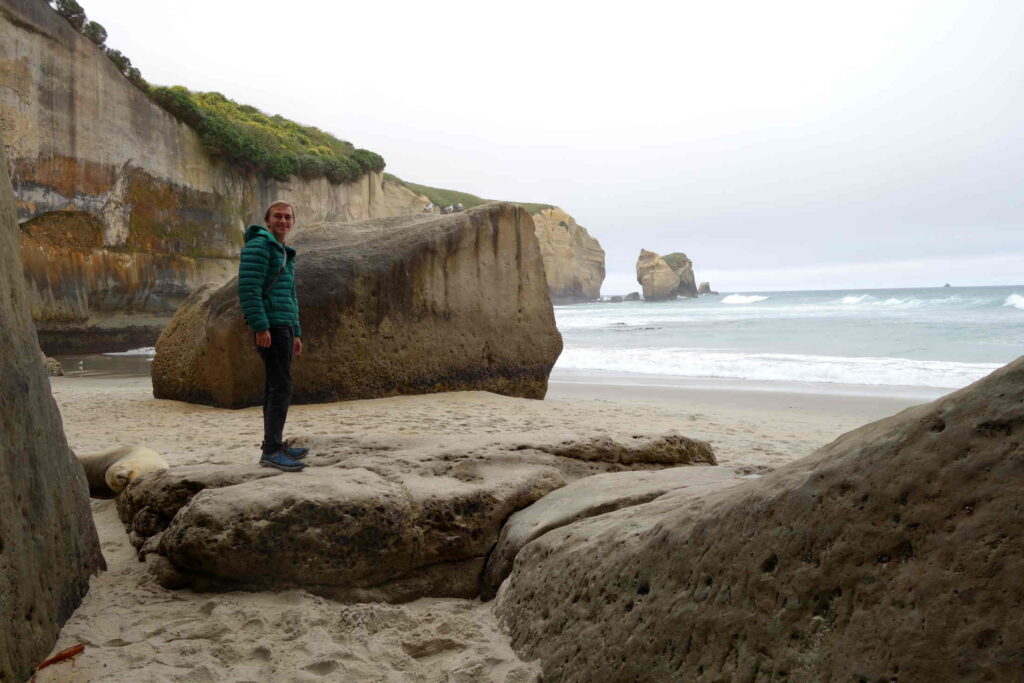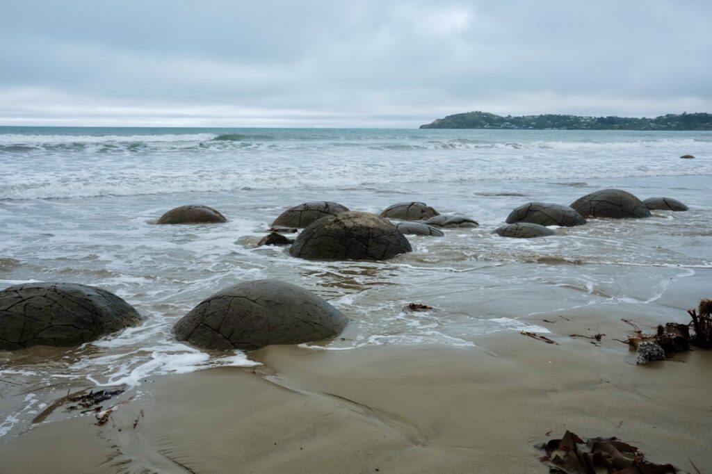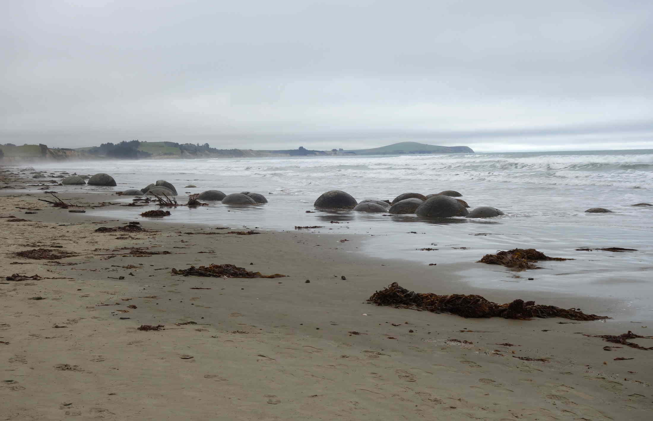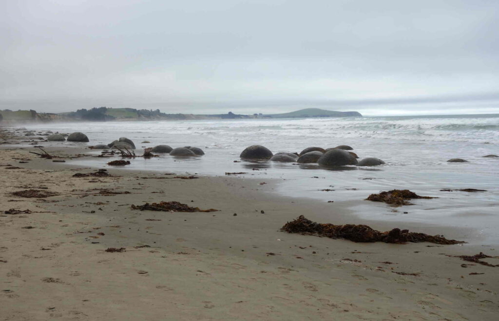 Auf dem Weg nach Balclutha haben wir als Erstes die Moeraki Boulders besucht. Das sind teils bis zu 5 Millionen Jahre alte, runde Steine, die an der Küste vergraben sind und einen Durchmesser von 0,5 bis 2,2 Meter haben. Das Wasser legt nach und nach immer mehr Steine frei.