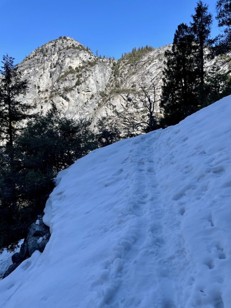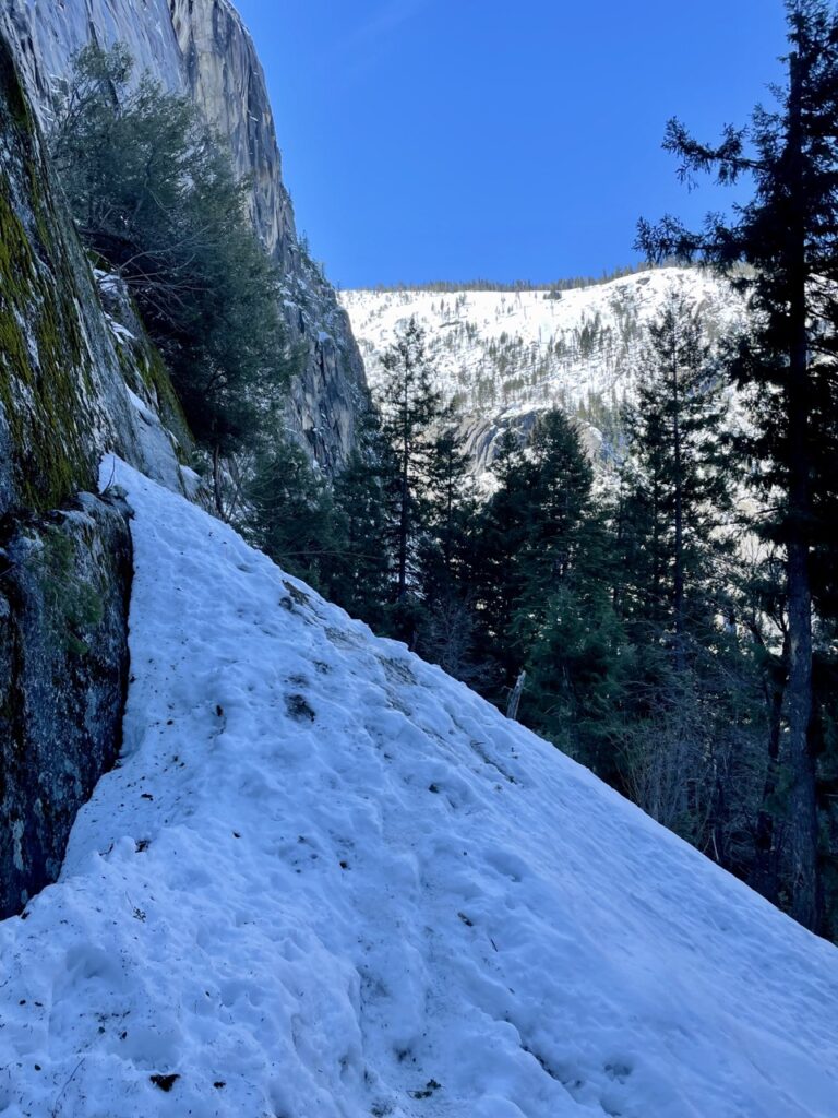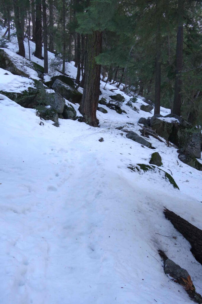 Es wurde immer verschneiter. Der Weg führt nach oben zum Vernal Fall (300 Meter Höhenunterschied) und anschließend zum Nevada Fall (610 Meter Höhenunterschied). Dass wir letzteren erreichen, haben wir recht bald abgeschrieben. Aber auch der Vernal Fall ist immer weiter in die Ferne gerückt. Warum? Weil es einfach so viele Schneerutsche gab, dass der Weg kaum zu erkennen war. Man sah ein paar Fußspuren, aber die wurden immer weniger. Auch wir haben irgendwann aufgeben müssen, weil es ohne einen richtigen Weg einfach viel zu steil und eisig wurde.