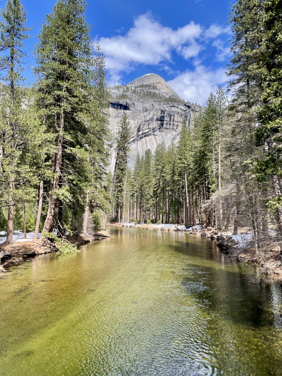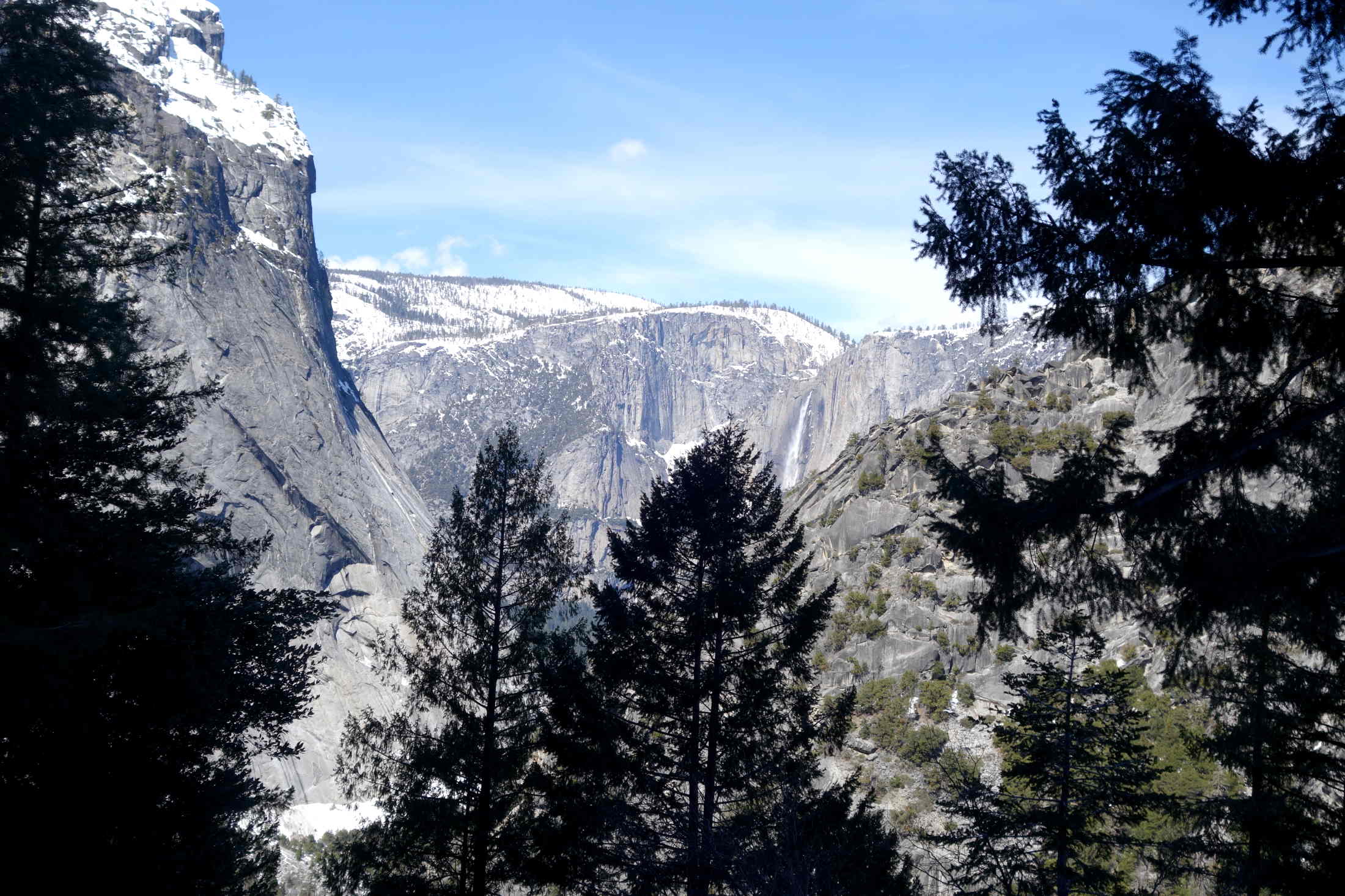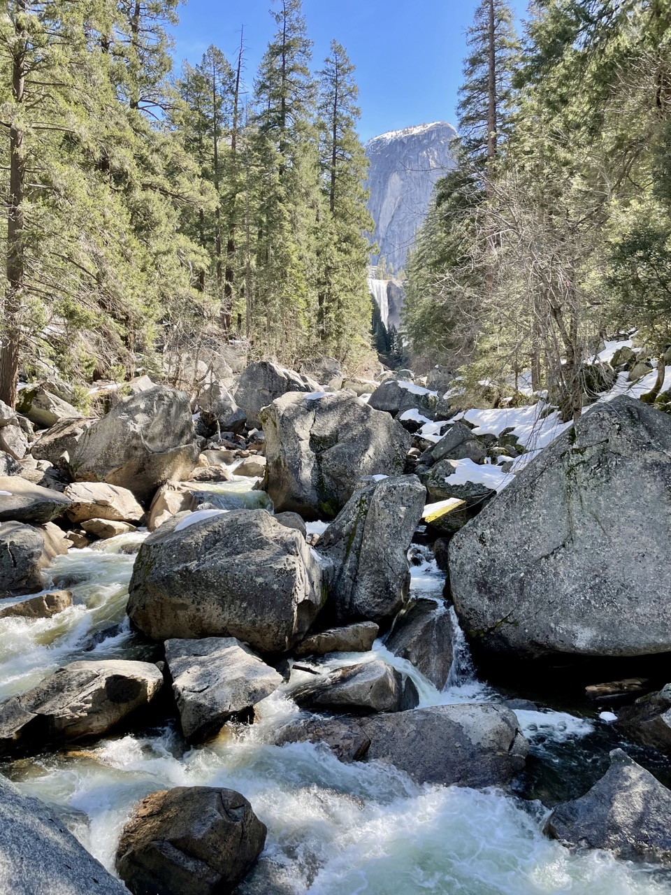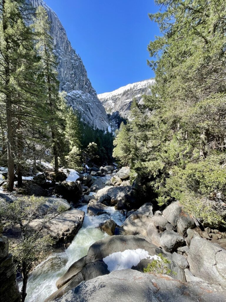 Im Park angekommen haben wir uns mit unseren Mikro-Spikes an den Füßen auf den Weg zum Vernal Fall bzw. Nevada Fall gemacht. Die eigentliche (kürzere) Route ist im Winter immer gesperrt, aber es gibt eine alternative Winterroute. Bis zum Zwischenstopp, der Vernal Falls Brücke (120 Meter Höhenunterschied), war alles gar kein Problem. Von dort aus konnte man auch schon den Vernal Fall in der Ferne sehen!