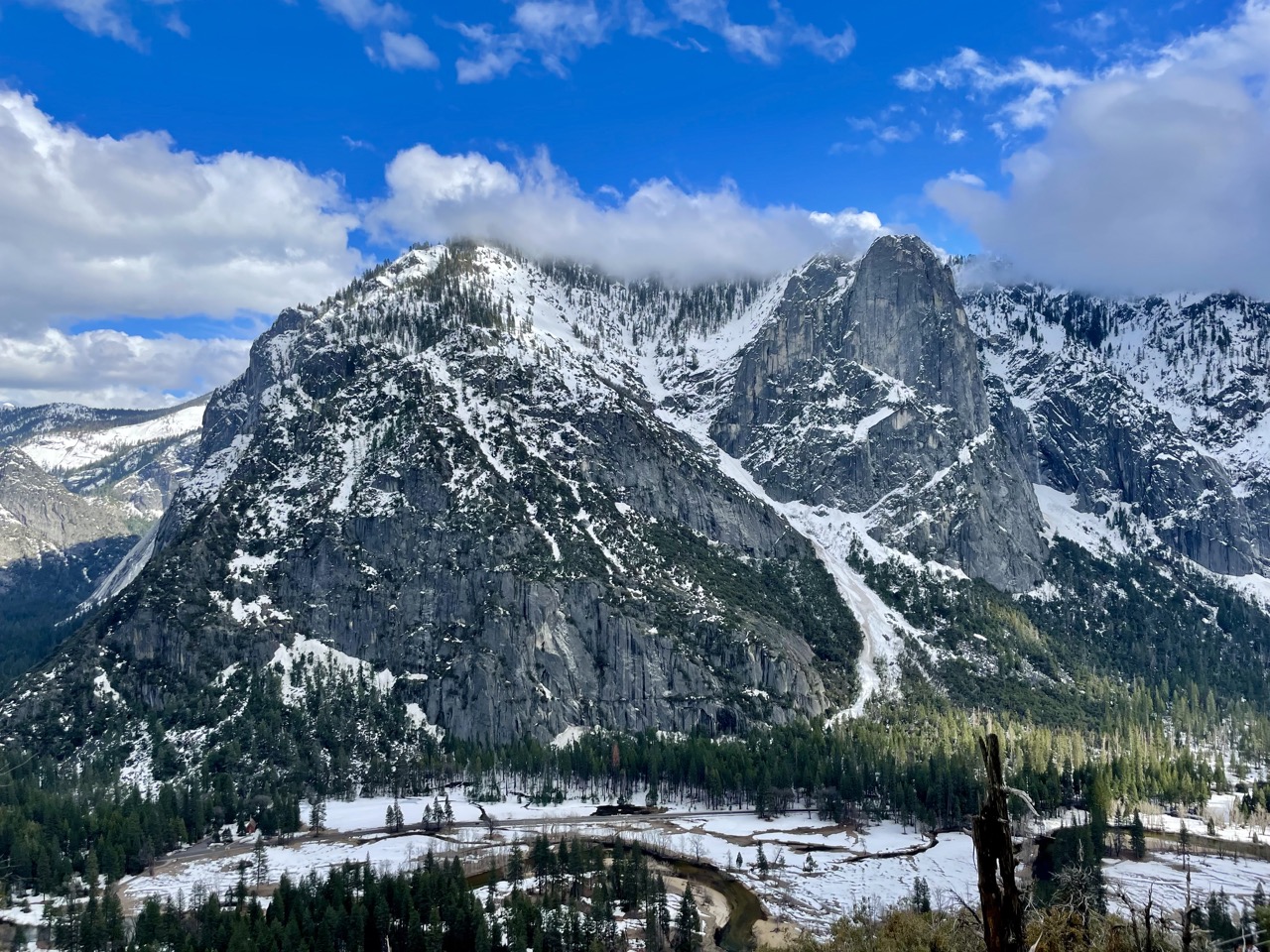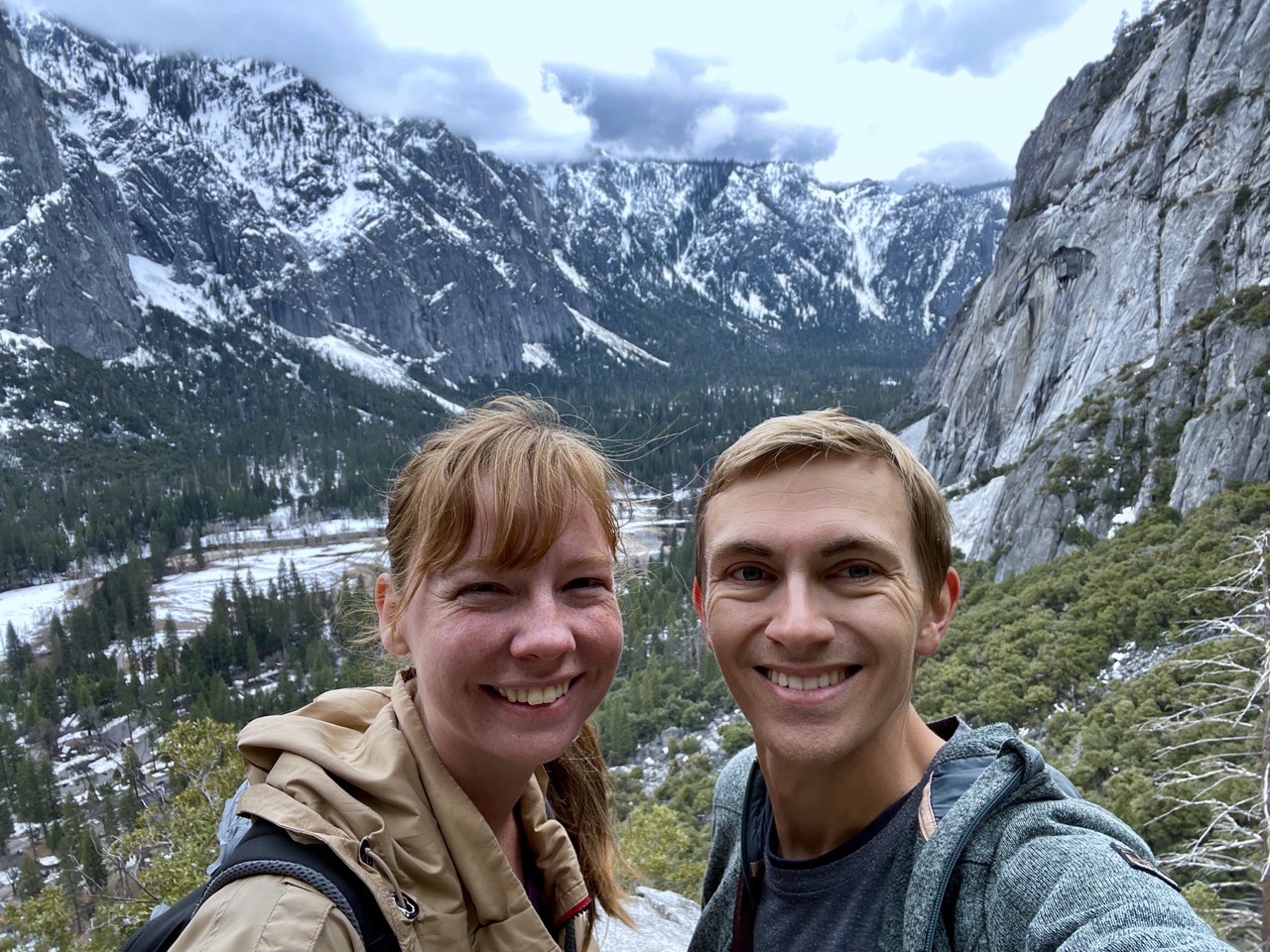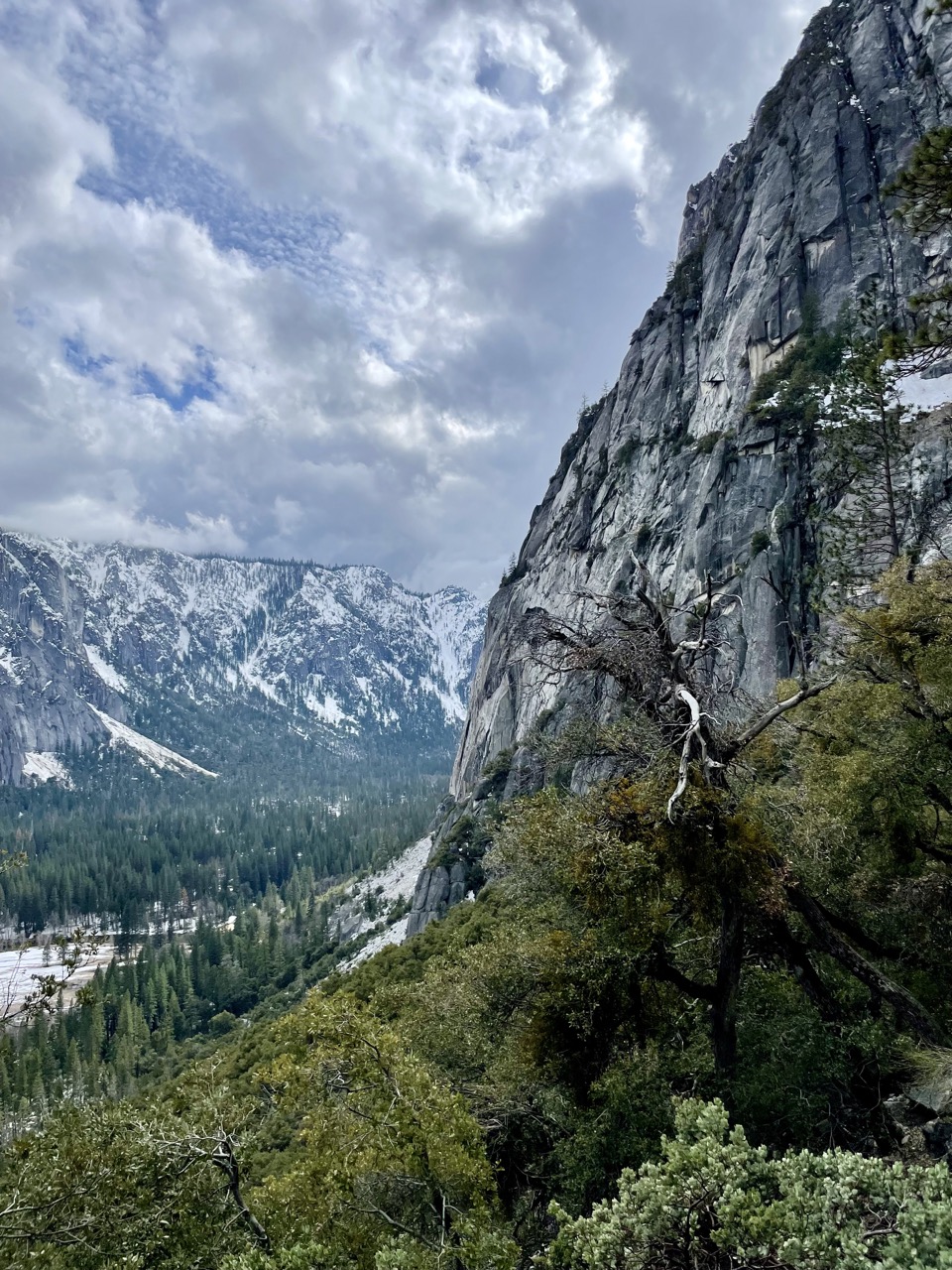 Aber das wäre doch gelacht, wenn wir nicht noch irgendwas Cooles hinbekommen! Nach kurzer Beratschlagung mit einer Rangerin haben wir uns gegen 15 Uhr dann noch auf den rund 5 km langen Anstieg zum Columbia Rock gemacht. Der liegt etwa auf einem Drittel Wegstrecke zum obersten Yosemite Fall und hat einen Höhenunterschied von 300 Metern. Tatsächlich war der steile Weg völlig schneefrei, sodass unsere Mikro-Spikes im Rucksack bleiben konnten. Von oben hat man eine wundervolle Sicht auf das Tal!