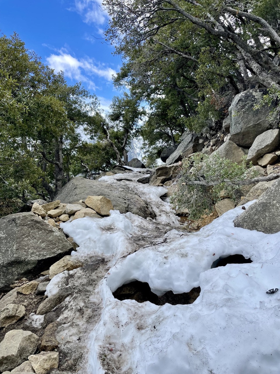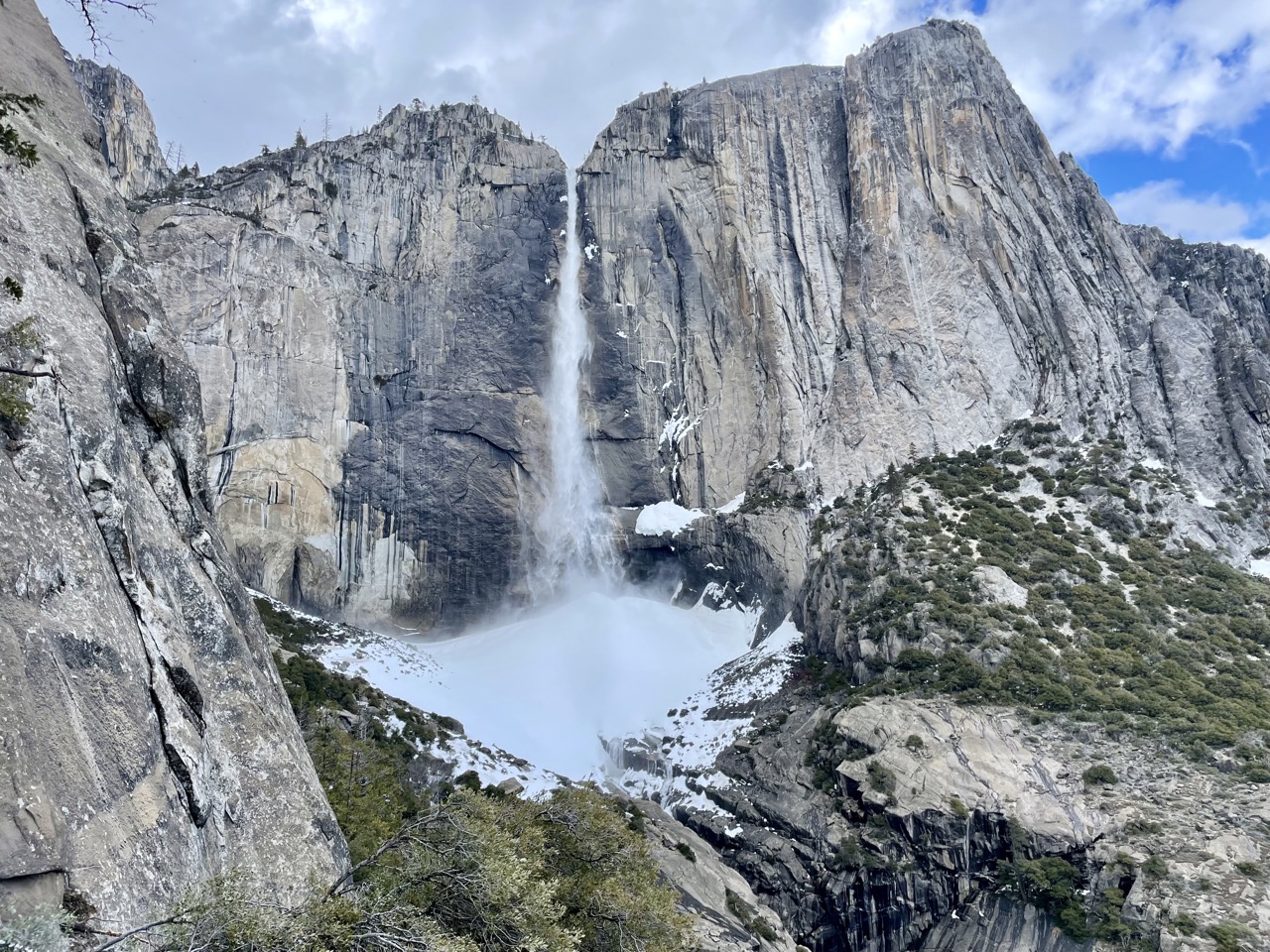 Aber unterwegs nach oben haben wir noch einen Tipp bekommen: Ungefähr 10 bis 20 Minuten weiter könnten wir den oberen Yosemite Fall ganz aus der Nähe sehen. Das haben wir uns nicht nehmen lassen wollen und sind los. Nach 15 Minuten, dem Platschen durch viele kleine Wasserfälle und Bäche und einem guten Stück Strecke über einen verschneiten Pfad (die Mikro-Spikes kamen wieder zum Einsatz!) sind wir dann auch tatsächlich angekommen. Und der Ausblick war phänomenal.