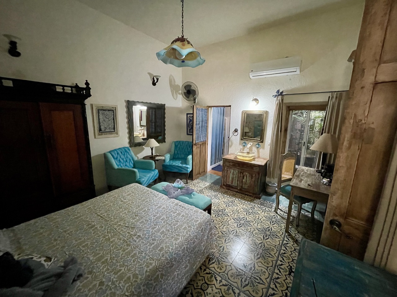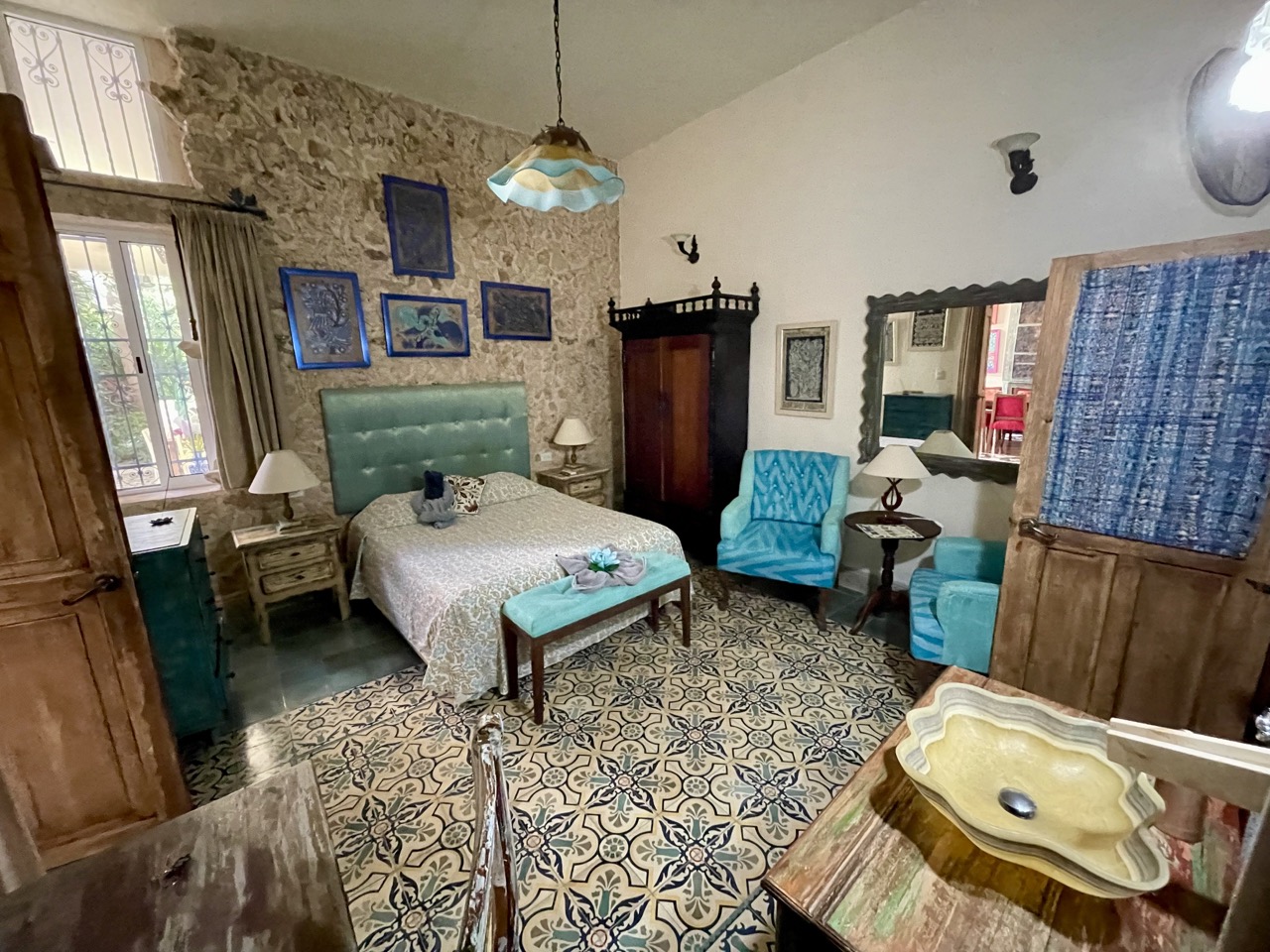In Merida hatten wir eine der schönsten Unterkünfte unserer Reise – bis jetzt. Es war eine alte Hacienda, die renoviert wurde. Wir hatten ein Doppelzimmer darin, eines von vielen, das thematisch eingerichtet war. Es gab einen Pool (den wir allerdings nicht genutzt haben) und sehr viele Sitzmöglichkeiten sowie eine Küche. Wir waren sehr froh, dass wir in dieser Hacienda die letzten zwei Nächte bekommen haben, die im Februar noch frei waren.