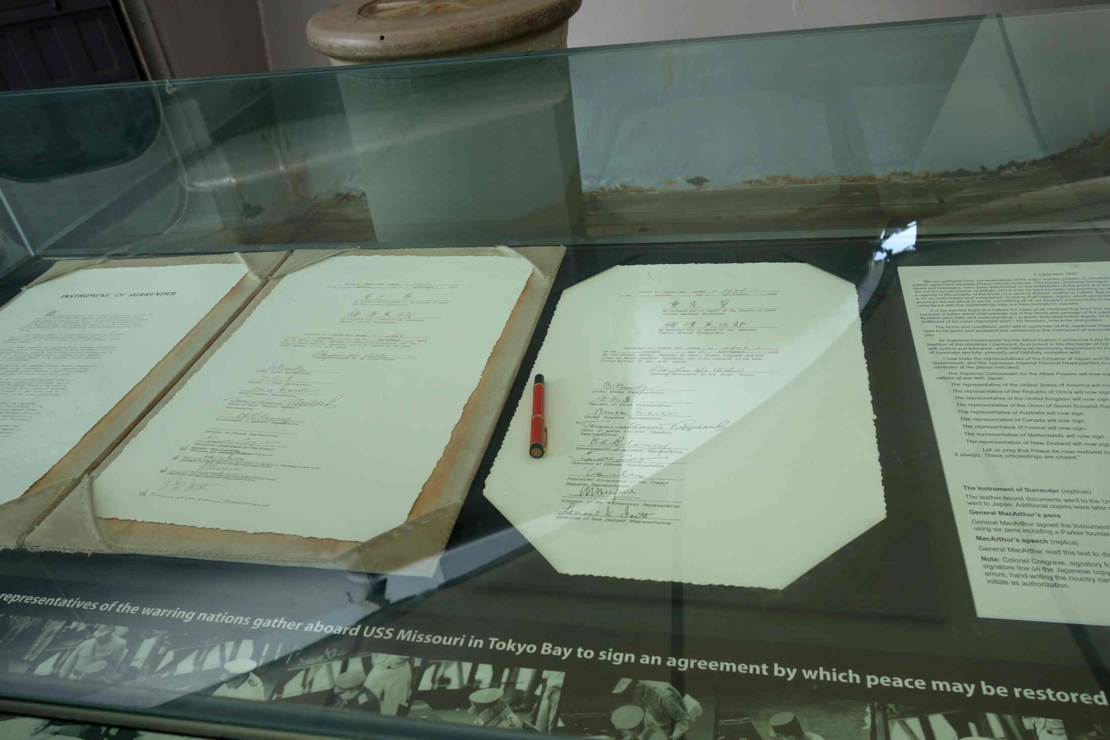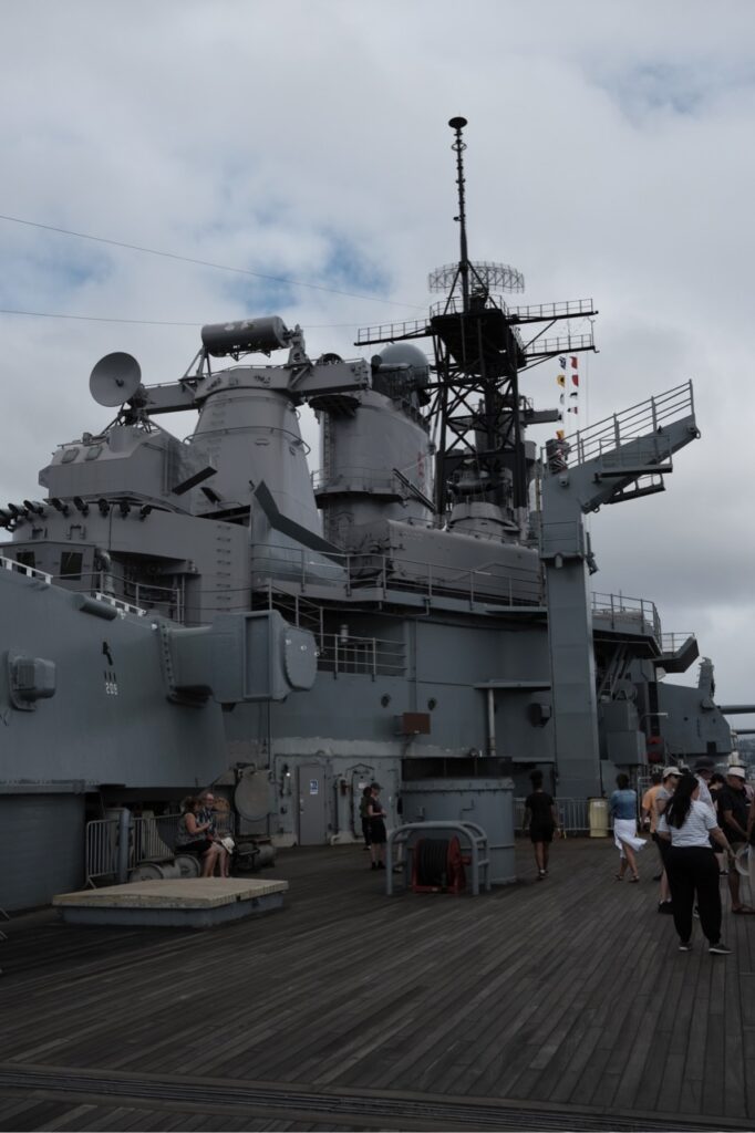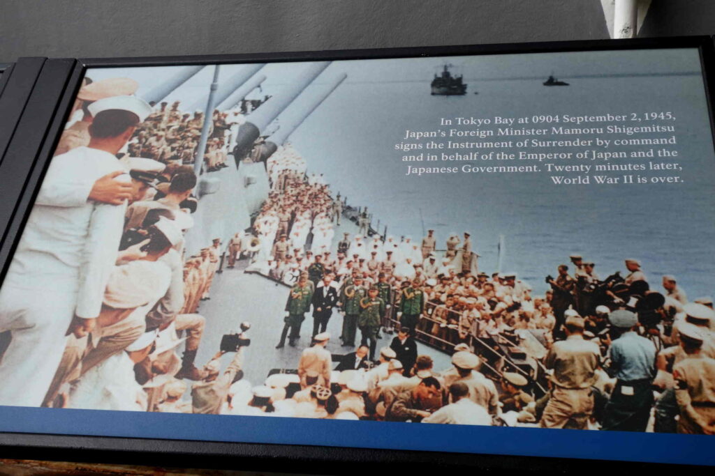 Als letztes haben wir das Kriegsschiff USS Missouri besucht, auf dem am 2.9.1945 die bedingungslose Kapitulation der Japaner unterzeichnet worden war und somit der zweite Weltkrieg beendet wurde. Wir konnten durch das Schiff gehen, die Schauplätze betrachten, die Kabinen, Aufenthaltsräume und und und. Natürlich auch das Deck, wo die Kapitulation unterzeichnet worden war, und die Stelle, wo ein Kamikaze-Flieger das Schiff getroffen hat. Uns hat die USS Missouri von der Art der Ausstellung besser gefallen, da alles sachlicher und (soweit eben möglich…) neutraler dargestellt wurde als bei der US Bowfin. Auch gab es einen Bereich über die japanischen Angreifer, vor allem die Kamikaze-Flieger, und wie sie sich auf ihren letzten Einsatz vorbereitet hatten.