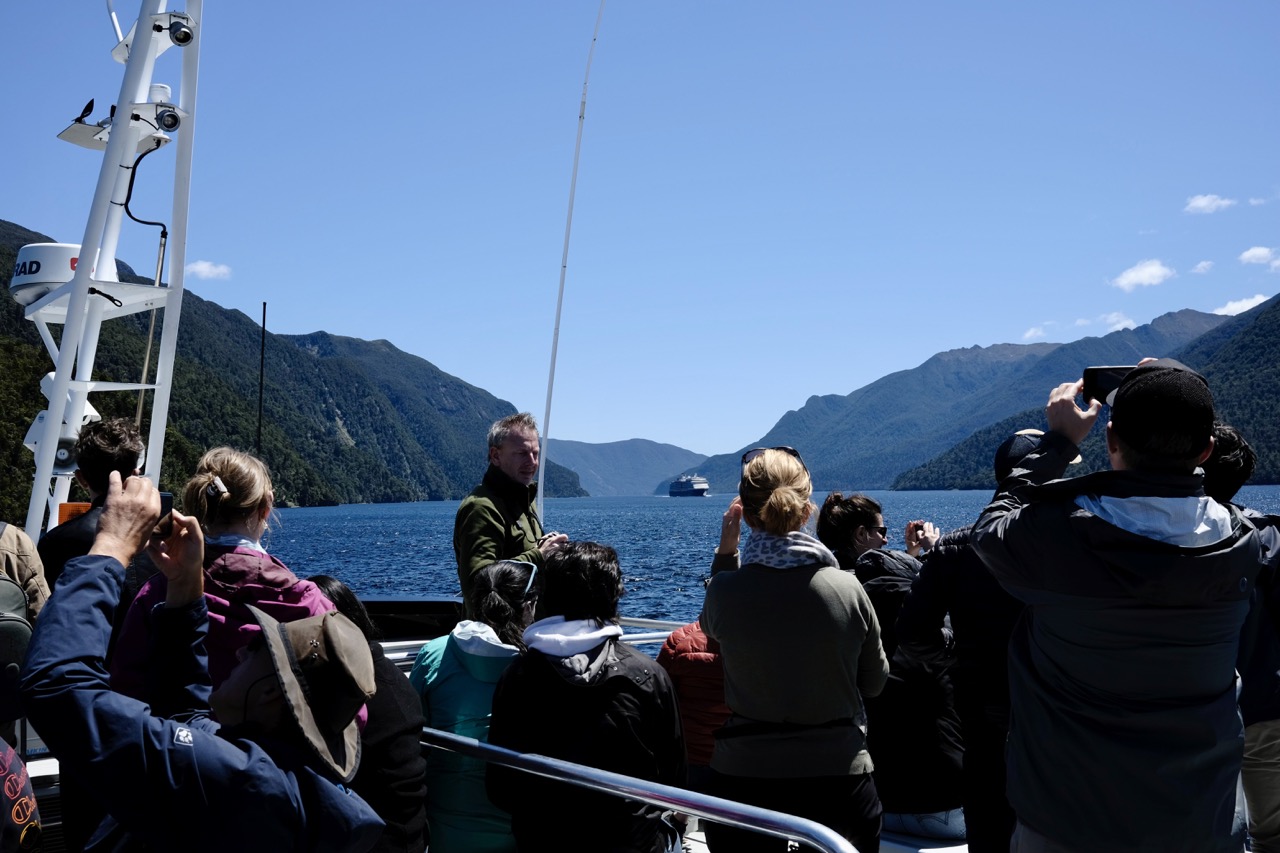 Am Lake Tekapo hatten wir jemanden kennengelernt, die uns vorgeschwärmt hatte, wie schön Doubtful Sound doch gewesen sei. Wir selbst hatten absolut keine Ahnung davon, haben uns haben mitreißen lassen und deshalb eine Tagestour von Te Anau, wo wir sowieso zwei Nächte Campingplatz gebucht hatten, nach Doubtful Sound gebucht. Das waren ca. eine Stunde Schifffahrt und eine Stunde Busfahrt, um dann ca. 3 Stunden auf einem weiteren Schiff in Doubtful Sound zu verbringen.