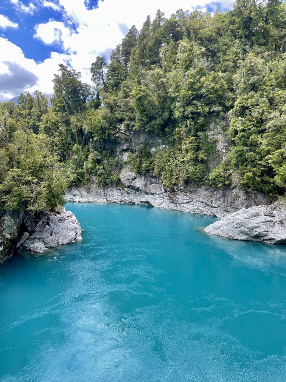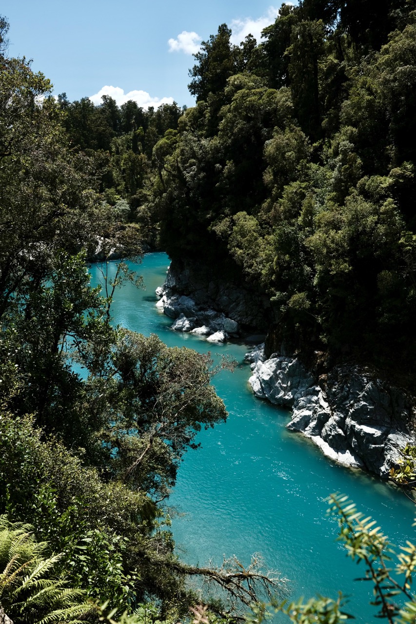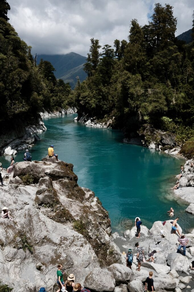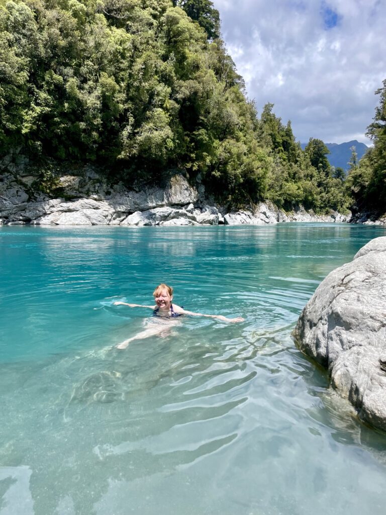 Ein sehr erwähnenswerter Stopp war in Hokitika. Zuerst waren wir ein wenig dort am Strand, aber das wirkliche Herzstück für uns war Hokitika Gorge. Dort gab es einen kleinen Rundweg und als wir damit fertig waren, konnten wir es uns nicht nehmen lassen, in das wunderschöne blaue (und wirklich kalte) Wasser einzutauchen.