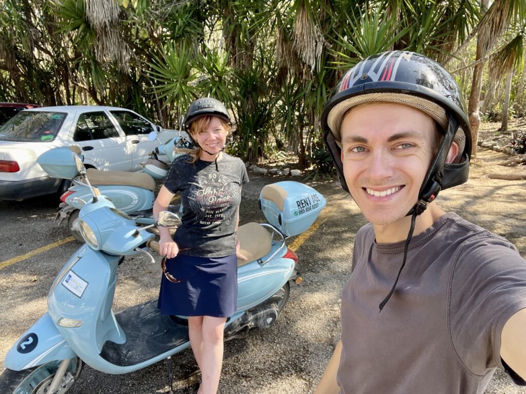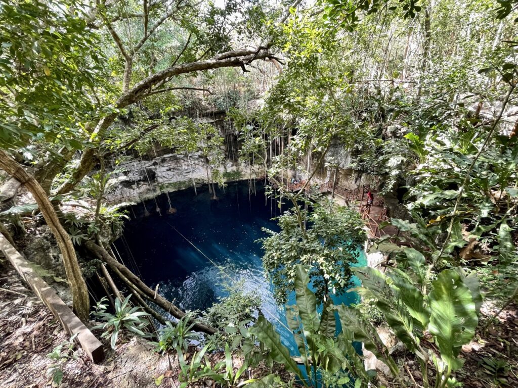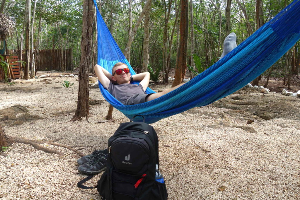 Mit dem Roller sind wir zur ersten Cenote an diesem Tag, Secreto Maya, was wahrscheinlich die schönste Cenote war, die wir uns angeschaut haben. Man konnte dort schwimmen gehen (auch ohne Schwimmweste!). Sie war zwar vom Stil her sehr ähnlich zur Cenote Ik Kil bei Chichen Itza, aber es war sehr viel menschenleerer (da auch abgelegener), sodass man seine Ruhe hatte. Das Tolle war auch, dass wir nicht nur schwimmen konnten. Man hatte dort auch die Möglichkeit, einfach mal in der Natur zu entspannen – zum Beispiel in einer Hängematte. Es gab außerdem ein Gratisgetränk, nachdem wir gesagt haben, aus welchem Hostel wir kommen!