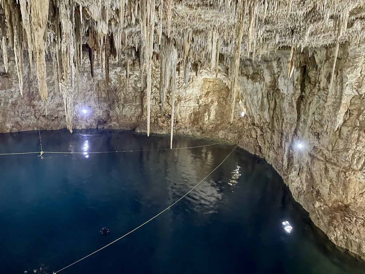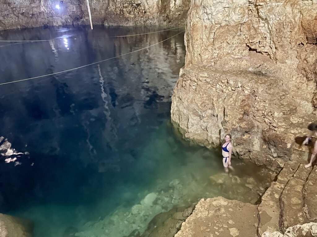 Die zweite Cenote, die wir besucht haben, war eine Cenote, bei der es nur ein kleines Loch in der Decke gab, sodass das Licht reinscheinen konnte. Leider war es sehr bewölkt zu diesem Zeitpunkt, sodass man das nicht ganz so gut gesehen hat. Die Höhle selbst war aber sehr beeindruckend mit seinen Stalaktiten.