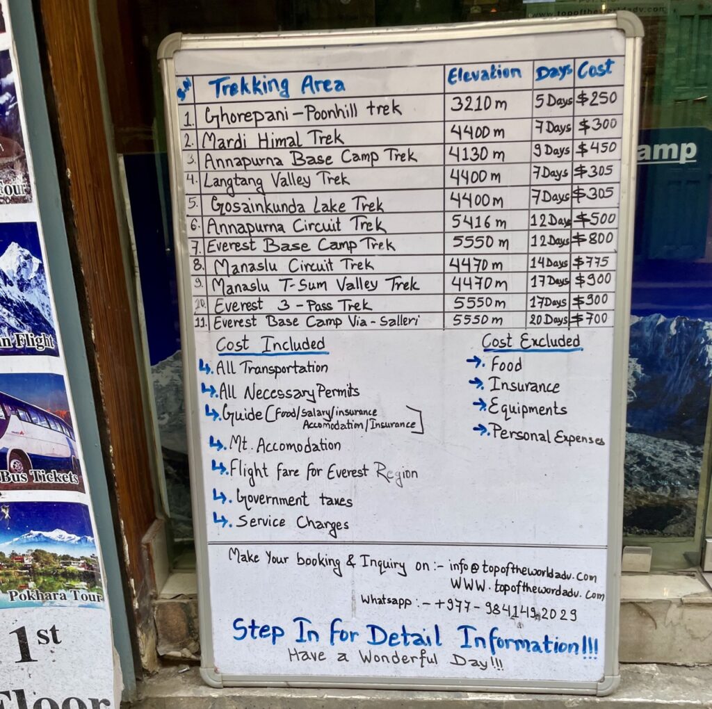 In Kathmandu und Pokhara gibt es auf jeden Fall auch viele Büros am Straßenrand, die einem Wandertouren verkaufen. Wir wollen hier noch kurz unsere Erfahrung mit Preisen zusammenfassen. Dazu vorab: Auf beiden Touren waren nur wir beide unterwegs. Normalerweise finden solche Touren als Gruppenwanderungen statt, also je nachdem wie viele Personen zu diesem Zeitpunkt buchen, aber da wir nicht in der Touristensaison da waren, gab es sonst niemanden außer uns beide.