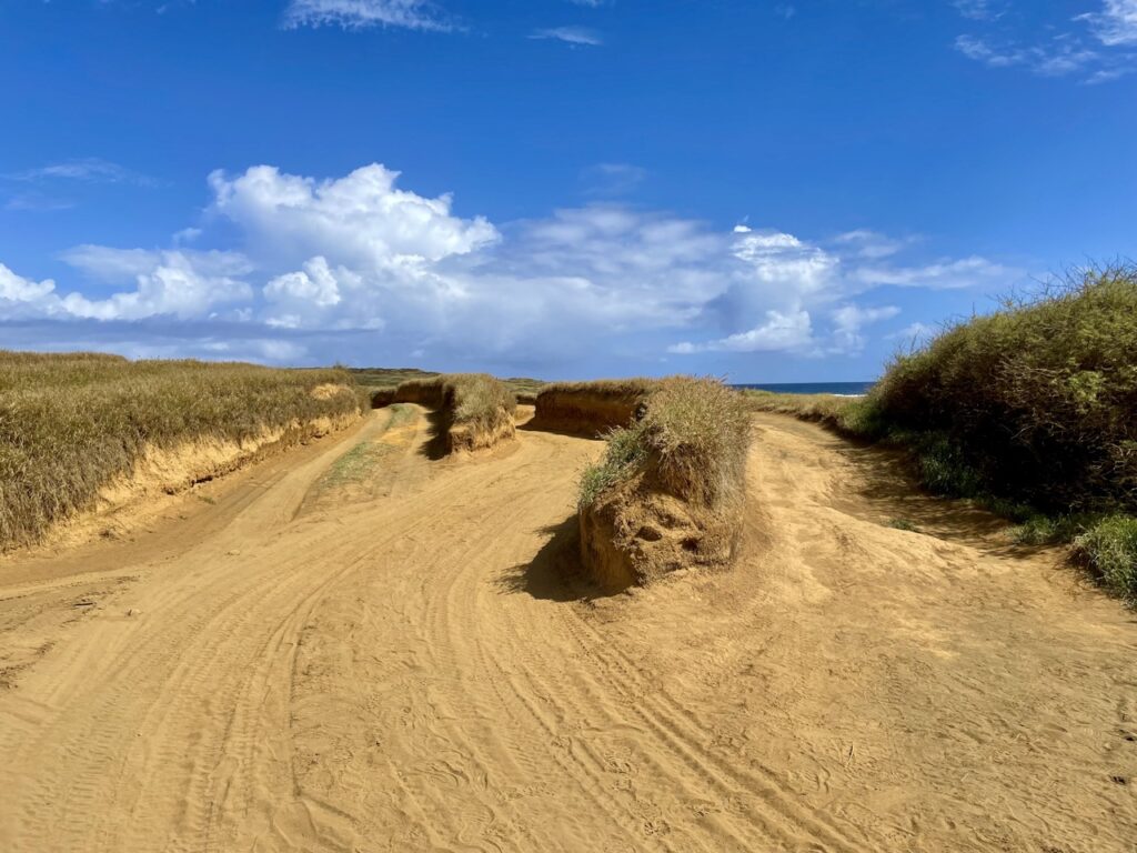 Nach etwa 20 Minuten unter dem wolkenlosen Himmel wurden wir auf dem Weg von zwei entgegenkommenden Wanderern angesprochen, wie ziemlich müde aussahen und uns gefragt haben, wie weit es denn noch sei. Und da dämmerte es uns langsam… Also hat Chris nachgesehen und wir haben rausgefunden, dass der Waldweg keine vier, sondern zwei Meilen gewesen war. Dementsprechend würde der Weg zum Strand etwa zwei Stunden in der brütenden Sonne sein! Aber umkehren wollten wir auch nicht mehr. Es gab nur noch den Weg nach vorne.