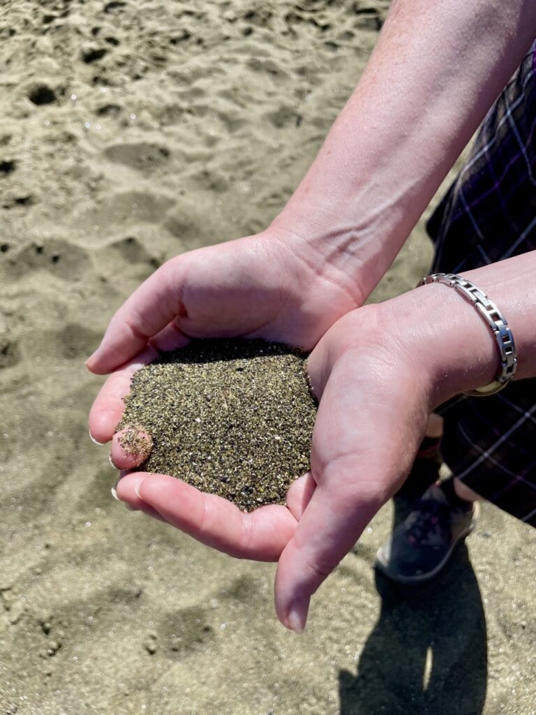 Nach eineinhalb Stunden kamen wir letztendlich wirklich am Strand an, der mit ein wenig Fantasie tatsächlich dunkelgrün schimmerte. Ich konnte es mir nicht nehmen lassen, zumindest mit den Füßen reinzugehen.